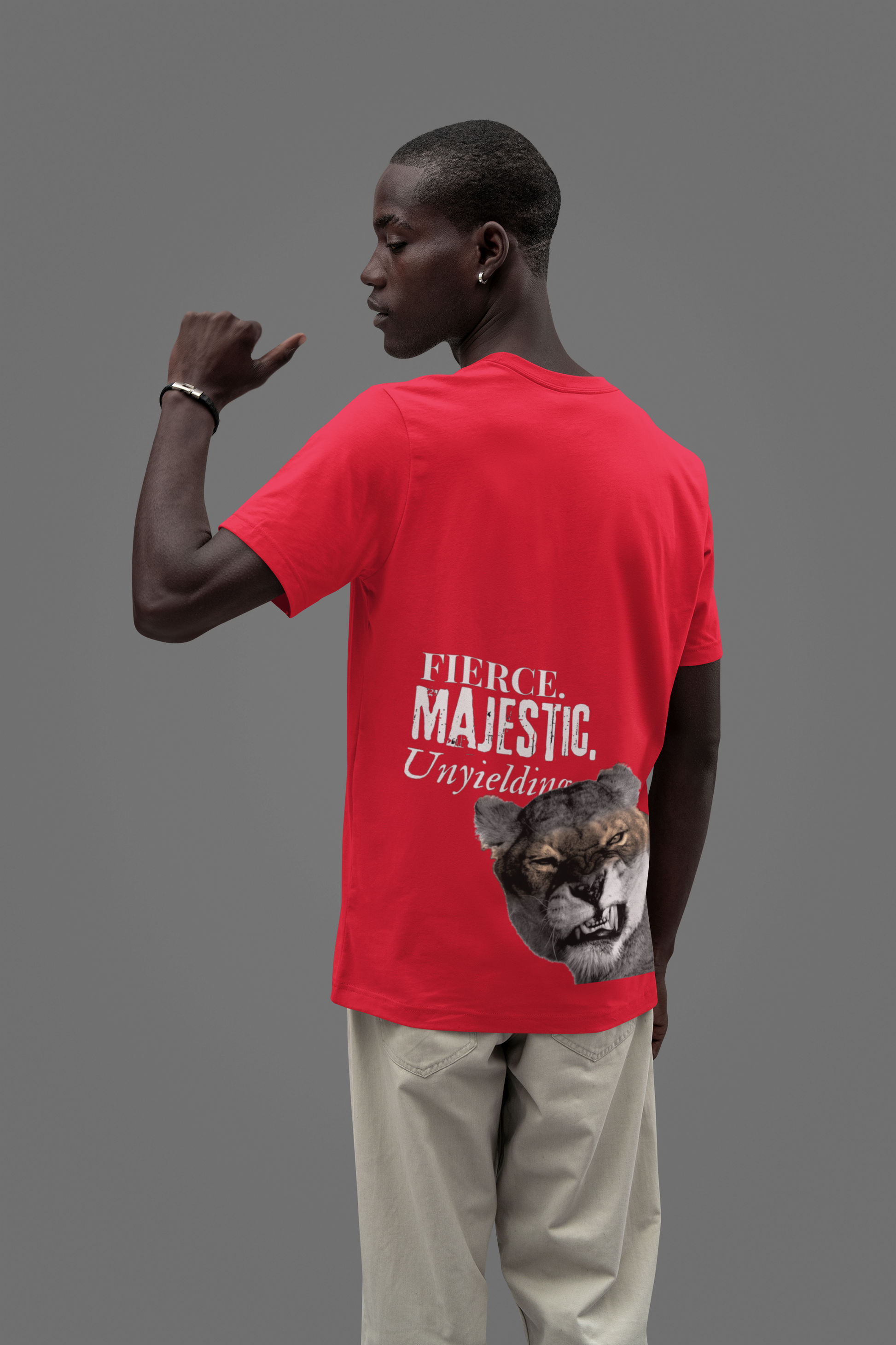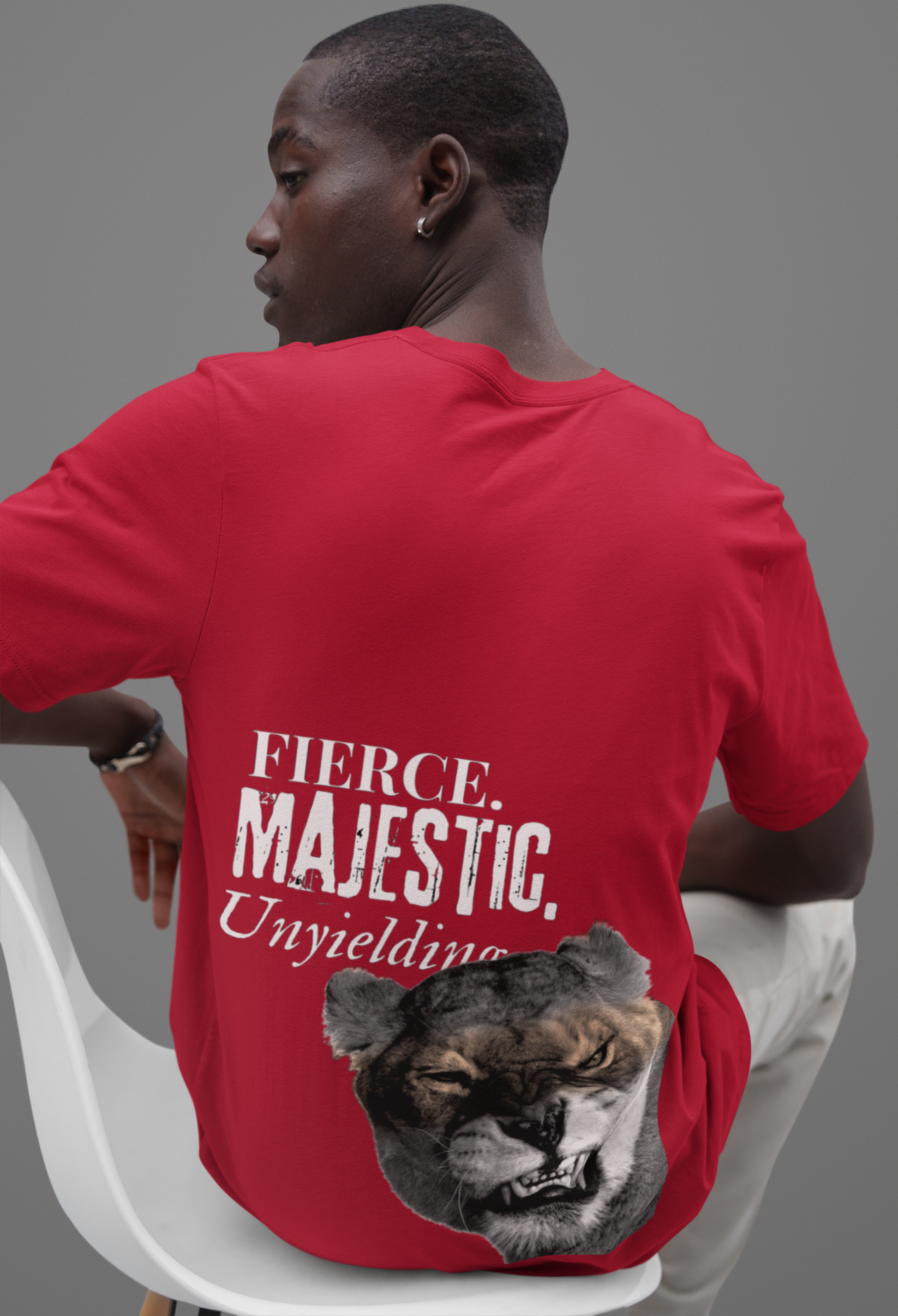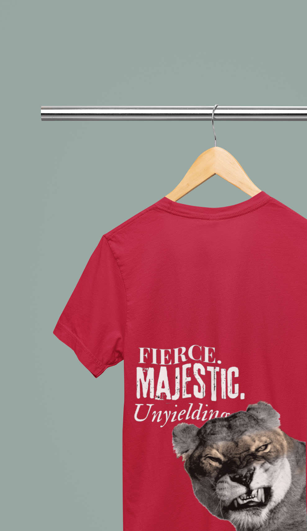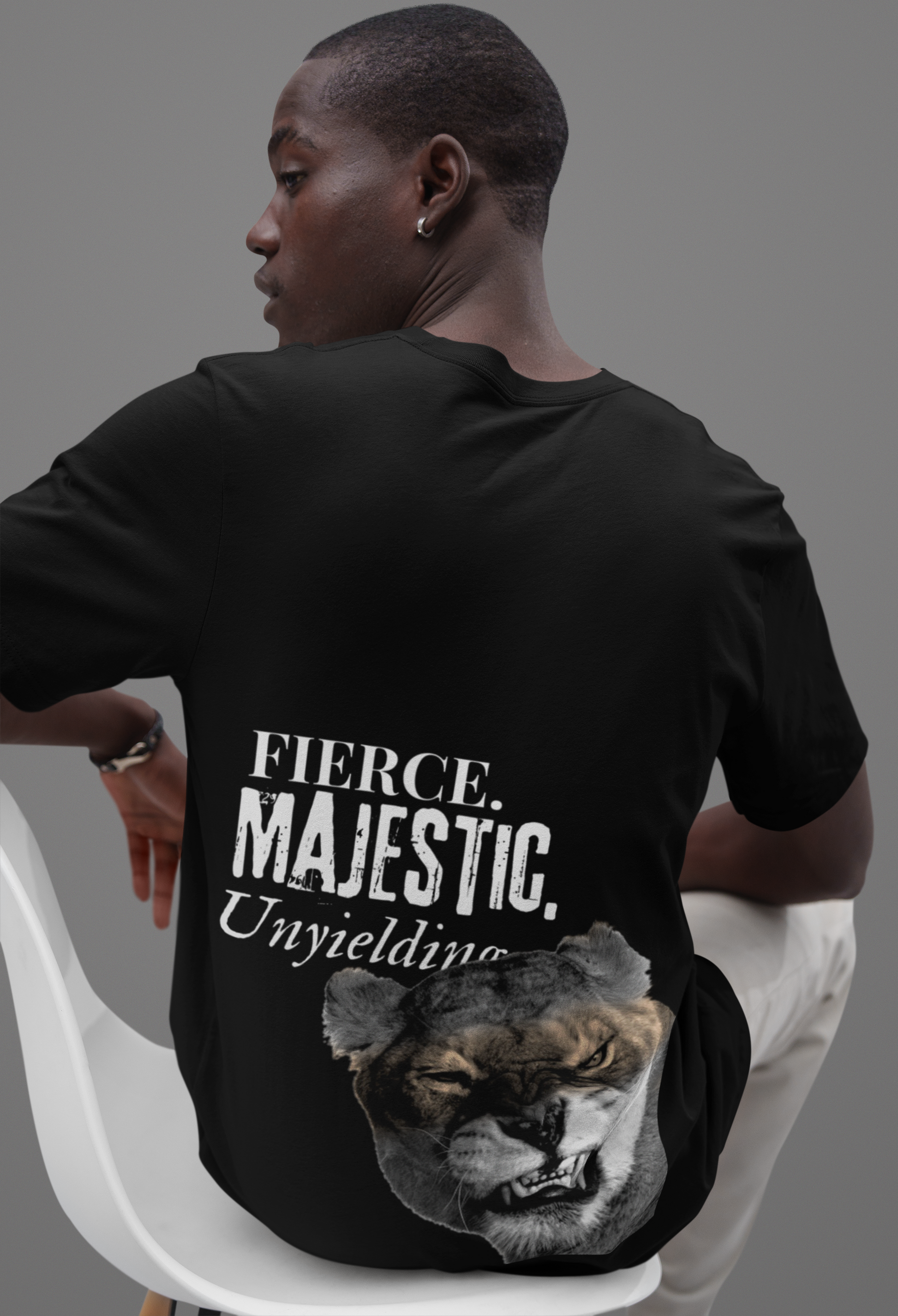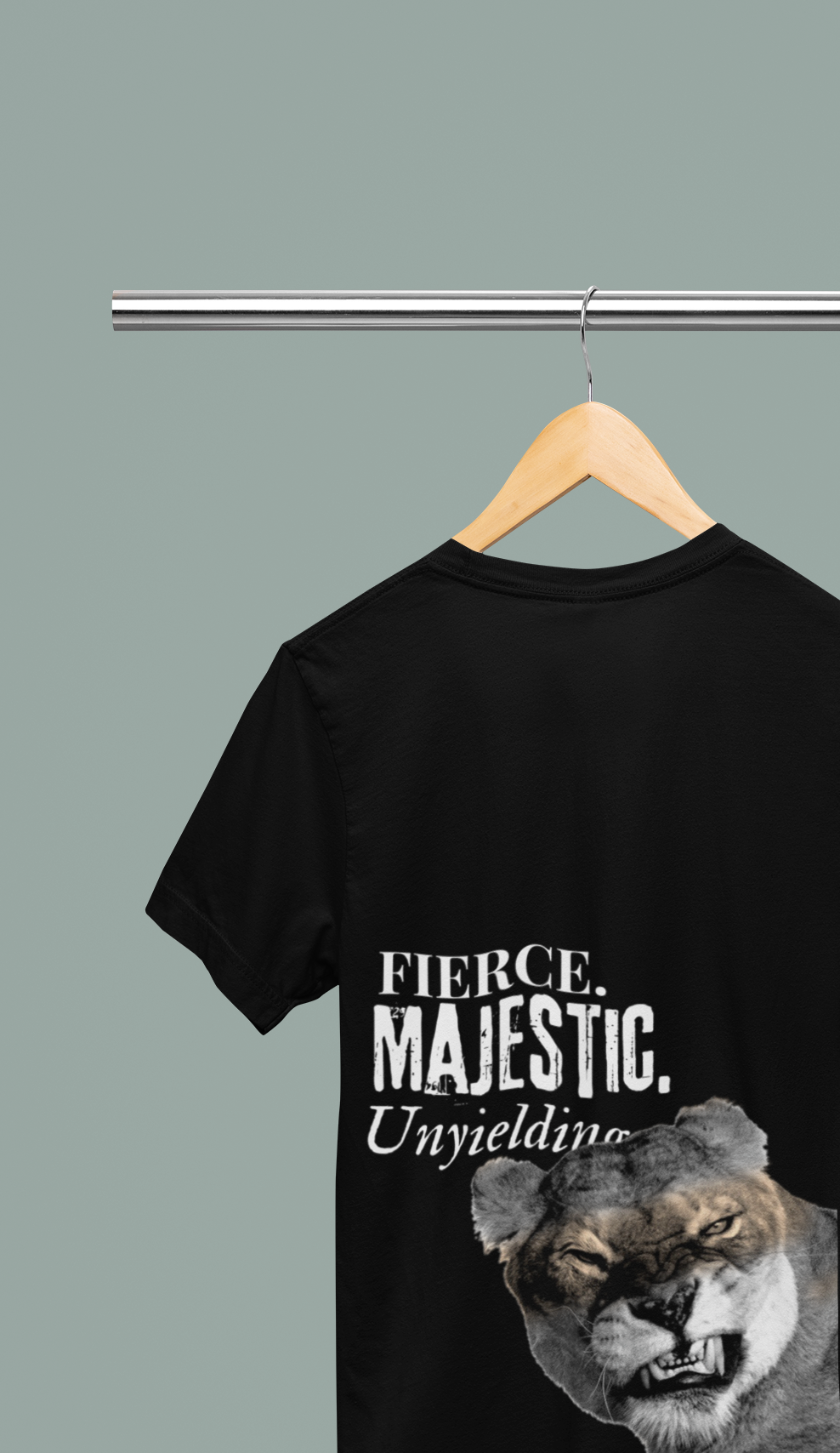 The design features the words “FIERCE. MAJESTIC. UNYIELDING.” printed with sharp precision, symbolizing the perfect balance of intensity, grace, and resilience. Whether you're on the move or making your presence felt in stillness, this tee captures the essence of unshakable character.