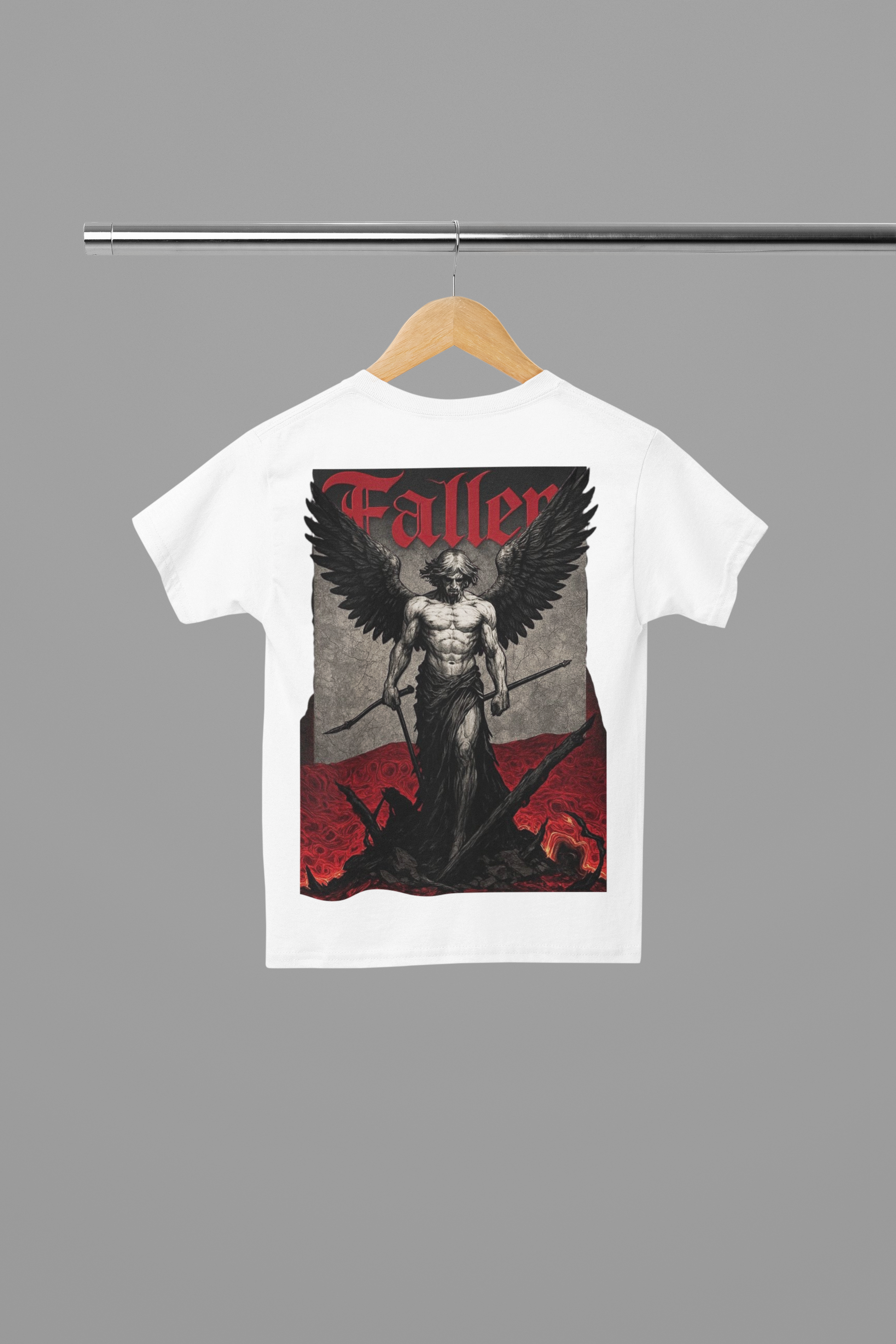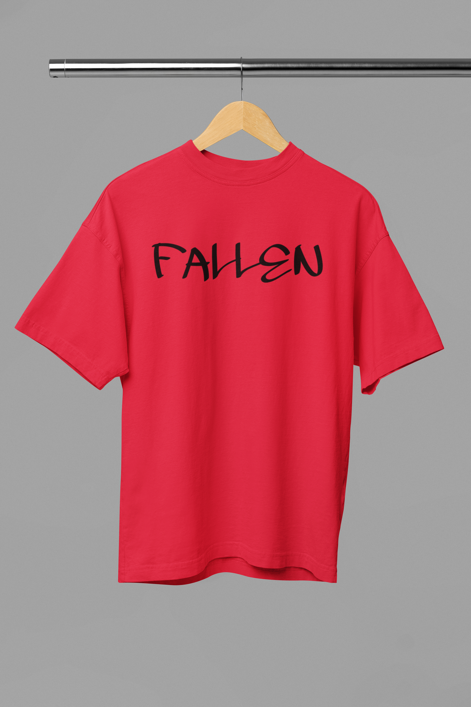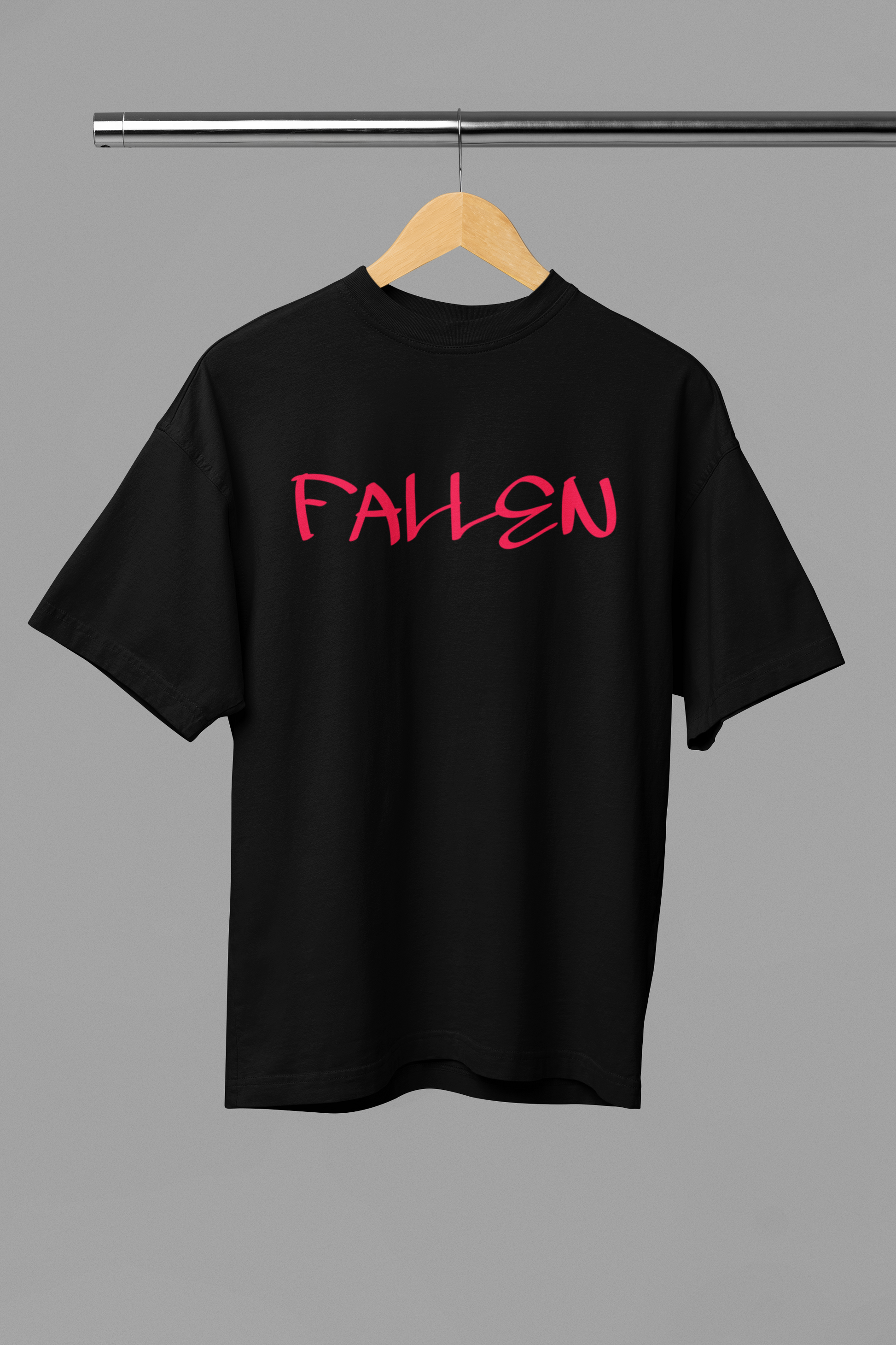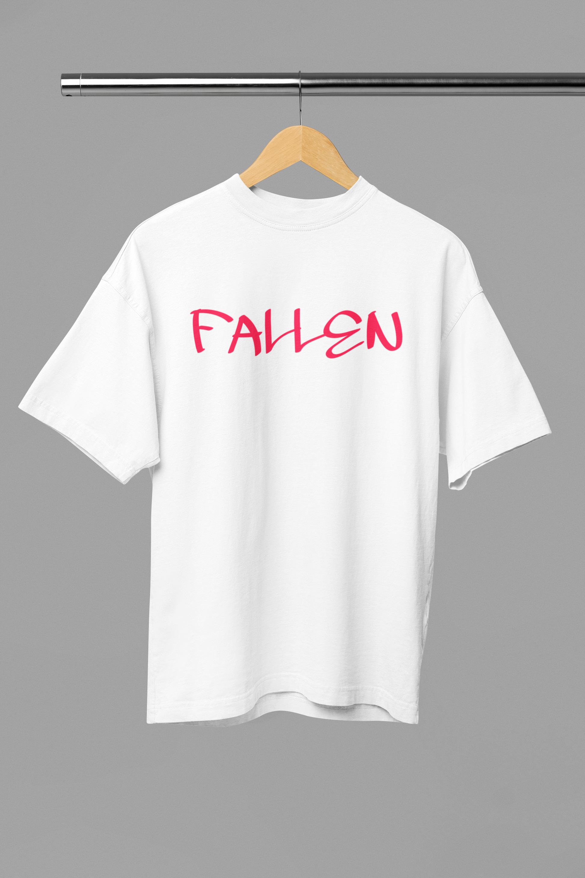 The centerpiece of the design is the word “FALLEN”, crafted in a distressed, high-impact font that speaks volumes without saying a word. It echoes themes of redemption, resilience, and the quiet power of those who’ve endured and evolved. Subtle yet evocative, the design taps into a darker aesthetic that pairs perfectly with street, grunge, or monochrome fashion styles.
